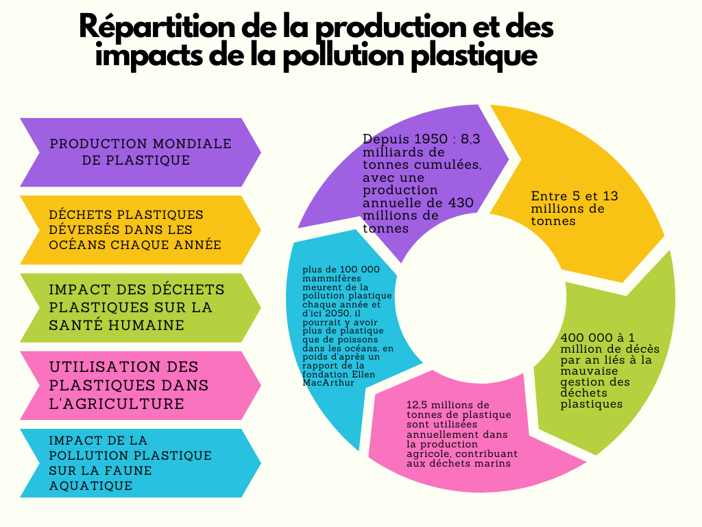 | Répartition géographique de la pollution plastique | Les océans sont particulièrement touchés, avec des accumulations de plastiques dans les gyres comme celui du Pacifique Nord. |